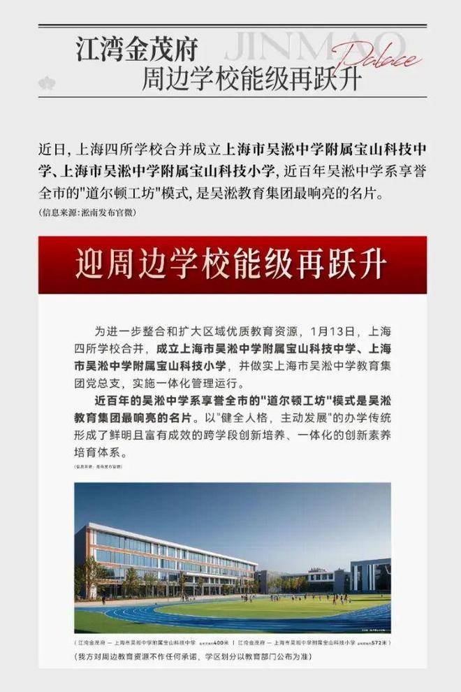 当板块内的教育资源通过战略合并与整合实现能级跃升,其带来的不仅是教育选择的优化,更是区域价值的深层加固。优质学校的聚集,始终是资产穿越周期最坚实的保障,为社区提供着持续而稳定的内生动力。上海四所学校合并成上海市吴淞中学附属宝山科技中学、上海市吴淞中学附属宝山科技小学两所重点学校,这将为江湾金茂府的未来价值提供重要支撑。