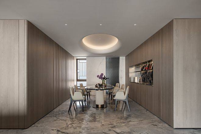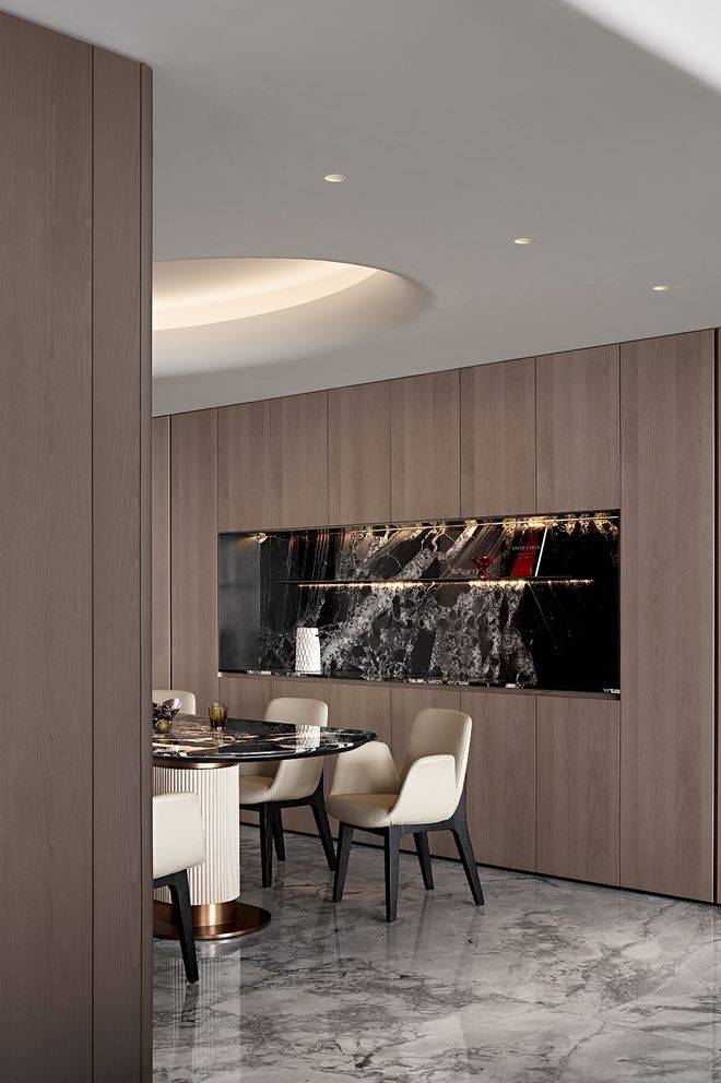 真正的奢侈,在于那些需要细看才能发现的用心。墙面木饰面采用上下异纹设计,嵌入纤细金属线条,于微妙起伏中塑造立体层次。