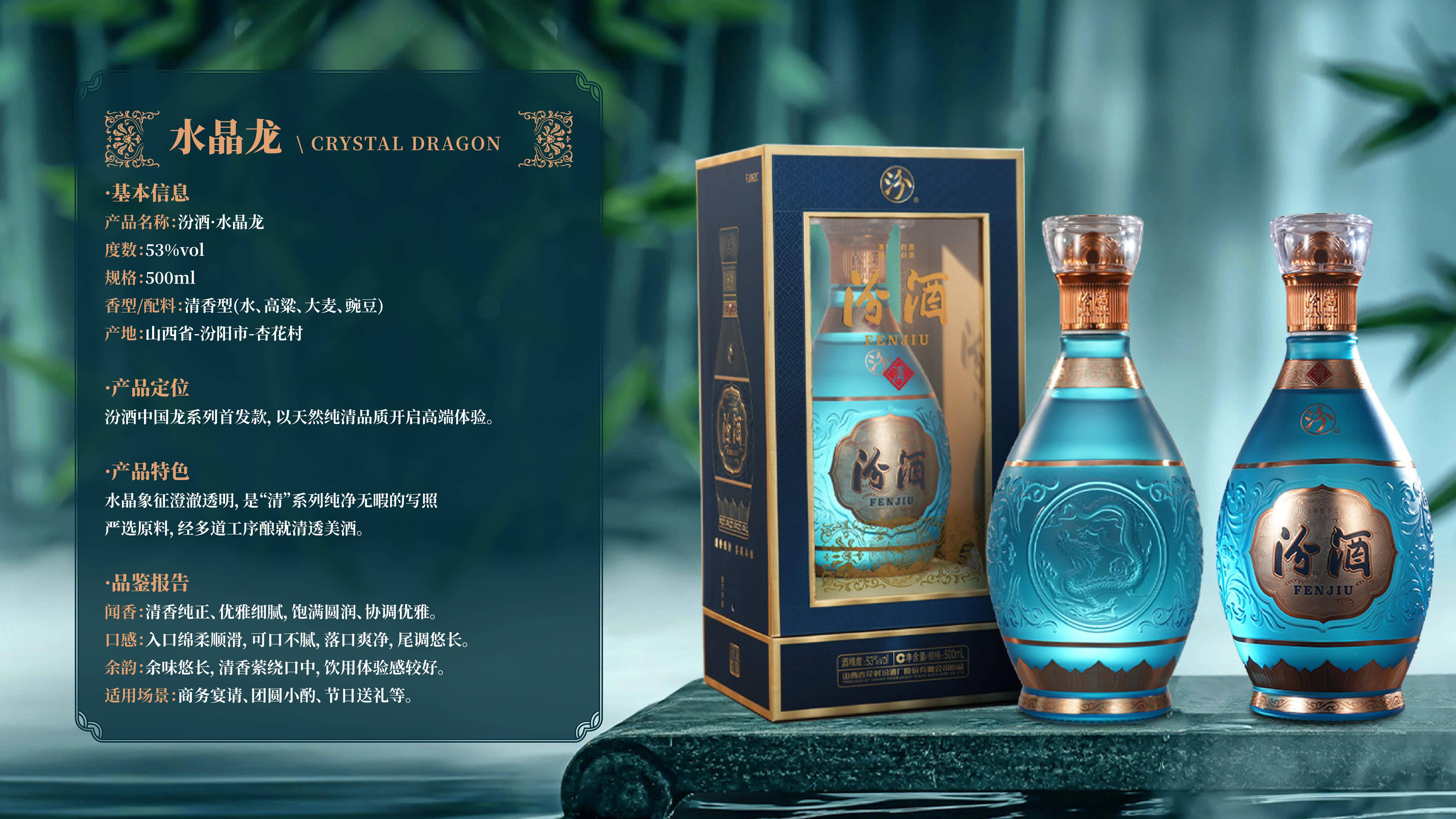 据悉,本次开业的汾酒体验中心以“龙御汾香 文明破晓”为核心主题,全方位展示汾酒战略高端旗舰——中国龙系列产品,将文化展示、酒饮品鉴、沉浸式体验融为一体,让每一位到访者都能沉浸式感受千年汾香与华夏龙图腾的碰撞。体验中心内,汾酒·中国龙系列全品亮相,水晶龙、青花龙、紫御龙、黄金龙四款产品各具特色,涵盖不同高端消费场景,满足商务宴请、珍藏纪念、文化雅集等多元需求。